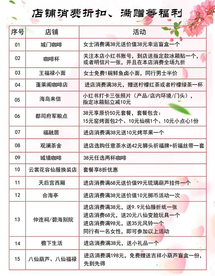 景区内15家店铺同步推出妇女节专属礼遇,消费满额即赠好礼,多家店铺更提供免费、折扣等优惠。