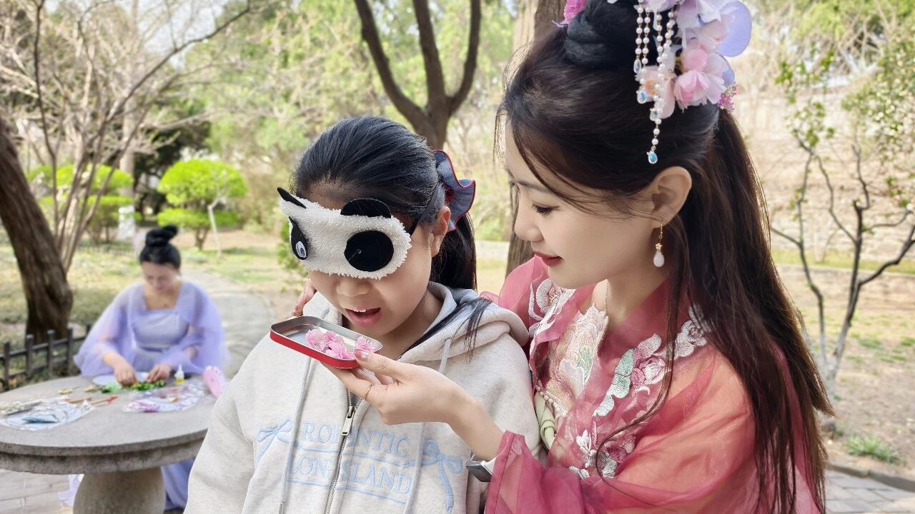 另一边,花神与游客围坐一桌,共同体验非遗手作之乐。素白团扇在花神指引下描摹出春日模样,轻声交流间,非遗手作的乐趣悄然传递。
