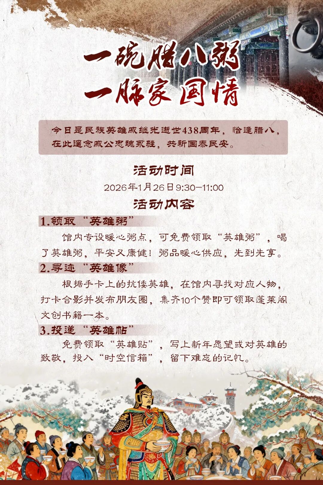 与此同时,戚继光纪念馆将开展主题文化体验。游客可在此免费领取并品尝寓意平安康健的“英雄粥”,在品味中缅怀历史。馆内设有“寻迹英雄”互动环节,游客可通过合影打卡等方式获取特色文创礼品;还能书写特制明信片,投递一封穿越时空的“家书”,抒发对家国平安的祝愿与新年的期盼。